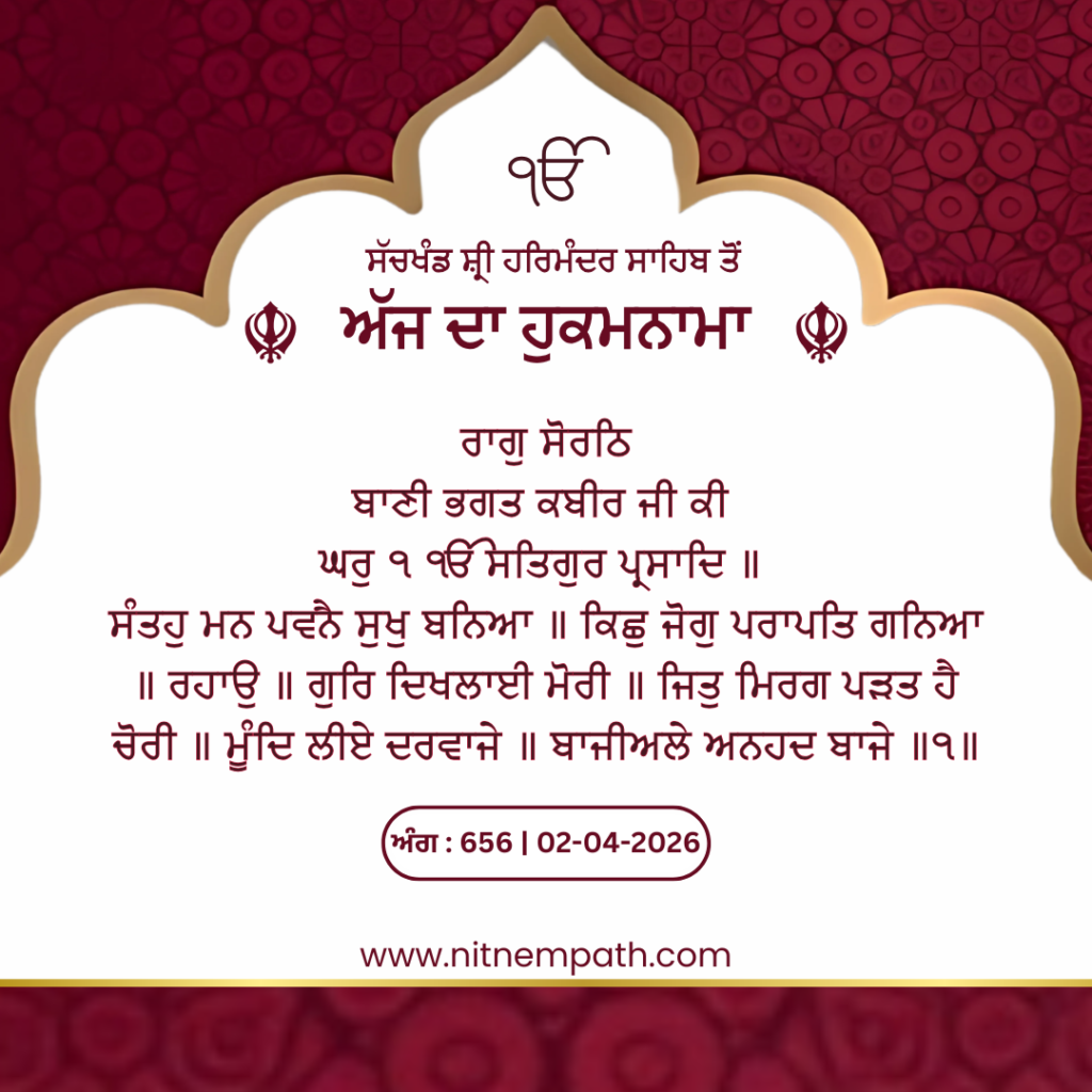 ਰਾਗੁ ਸੋਰਠਿ ਬਾਣੀ ਭਗਤ ਕਬੀਰ ਜੀ ਕੀ ਘਰੁ ੧ ੴ ਸਤਿਗੁਰ ਪ੍ਰਸਾਦਿ ॥ ਸੰਤਹੁ ਮਨ ਪਵਨੈ ਸੁਖੁ ਬਨਿਆ ॥ ਕਿਛੁ ਜੋਗੁ ਪਰਾਪਤਿ ਗਨਿਆ ॥ ਰਹਾਉ ॥ ਗੁਰਿ ਦਿਖਲਾਈ ਮੋਰੀ ॥ ਜਿਤੁ ਮਿਰਗ ਪੜਤ ਹੈ ਚੋਰੀ ॥ ਮੂੰਦਿ ਲੀਏ ਦਰਵਾਜੇ ॥ ਬਾਜੀਅਲੇ ਅਨਹਦ ਬਾਜੇ ॥੧॥
