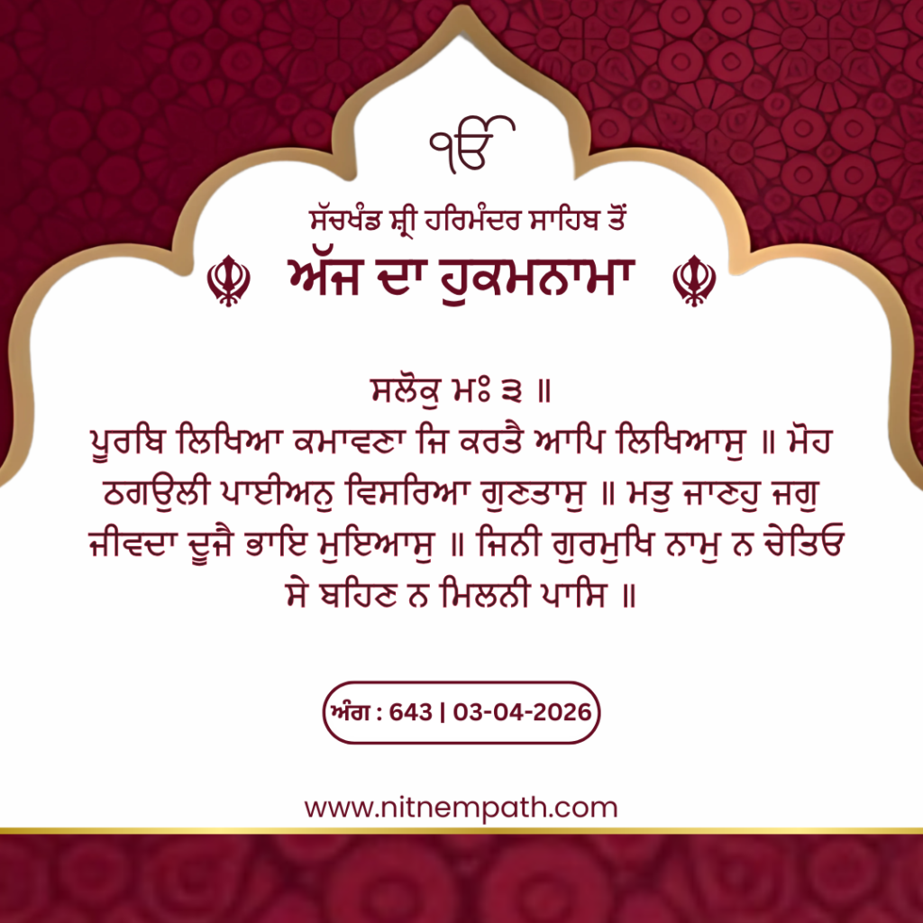 ਸਲੋਕੁ ਮਃ ੩ ॥ ਪੂਰਬਿ ਲਿਖਿਆ ਕਮਾਵਣਾ ਜਿ ਕਰਤੈ ਆਪਿ ਲਿਖਿਆਸੁ ॥ ਮੋਹ ਠਗਉਲੀ ਪਾਈਅਨੁ ਵਿਸਰਿਆ ਗੁਣਤਾਸੁ ॥ ਮਤੁ ਜਾਣਹੁ ਜਗੁ ਜੀਵਦਾ ਦੂਜੈ ਭਾਇ ਮੁਇਆਸੁ ॥ ਜਿਨੀ ਗੁਰਮੁਖਿ ਨਾਮੁ ਨ ਚੇਤਿਓ ਸੇ ਬਹਿਣ ਨ ਮਿਲਨੀ ਪਾਸਿ ॥