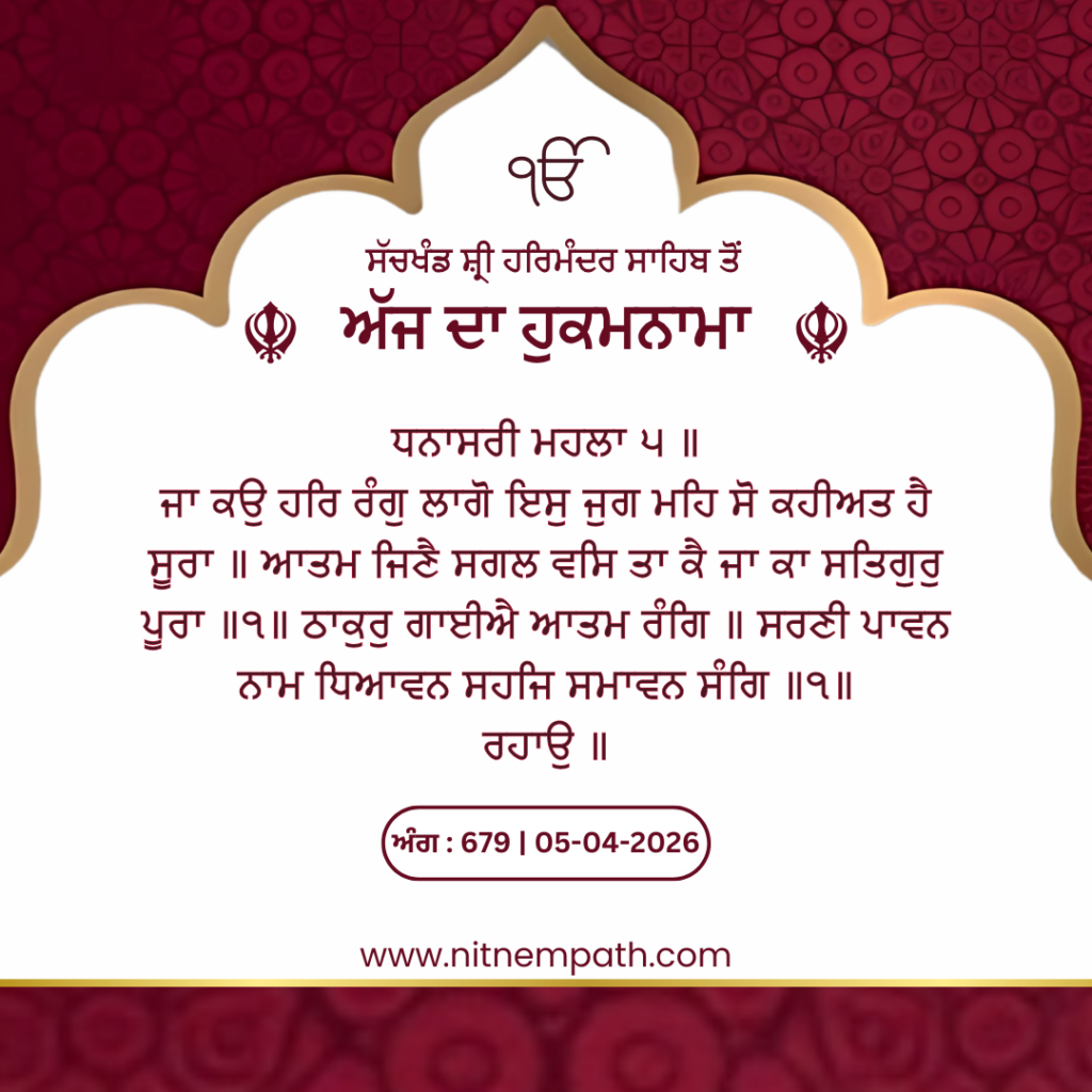 ਧਨਾਸਰੀ ਮਹਲਾ ੫ ॥ ਜਾ ਕਉ ਹਰਿ ਰੰਗੁ ਲਾਗੋ ਇਸੁ ਜੁਗ ਮਹਿ ਸੋ ਕਹੀਅਤ ਹੈ ਸੂਰਾ ॥ ਆਤਮ ਜਿਣੈ ਸਗਲ ਵਸਿ ਤਾ ਕੈ ਜਾ ਕਾ ਸਤਿਗੁਰੁ ਪੂਰਾ ॥੧॥
