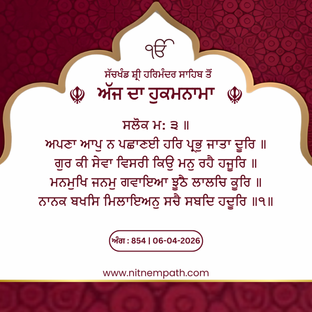 Hukamnama Sri Darbar Sahib, Amritsar, Date 06-04-2026 Ang 854