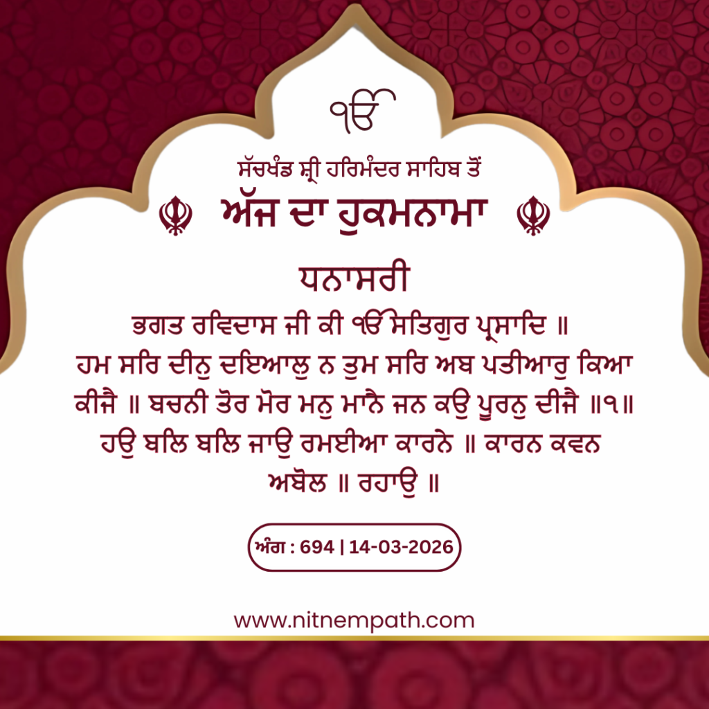 Hukamnama Sri Darbar Sahib, Amritsar, Date 14-03-2026 Ang 694