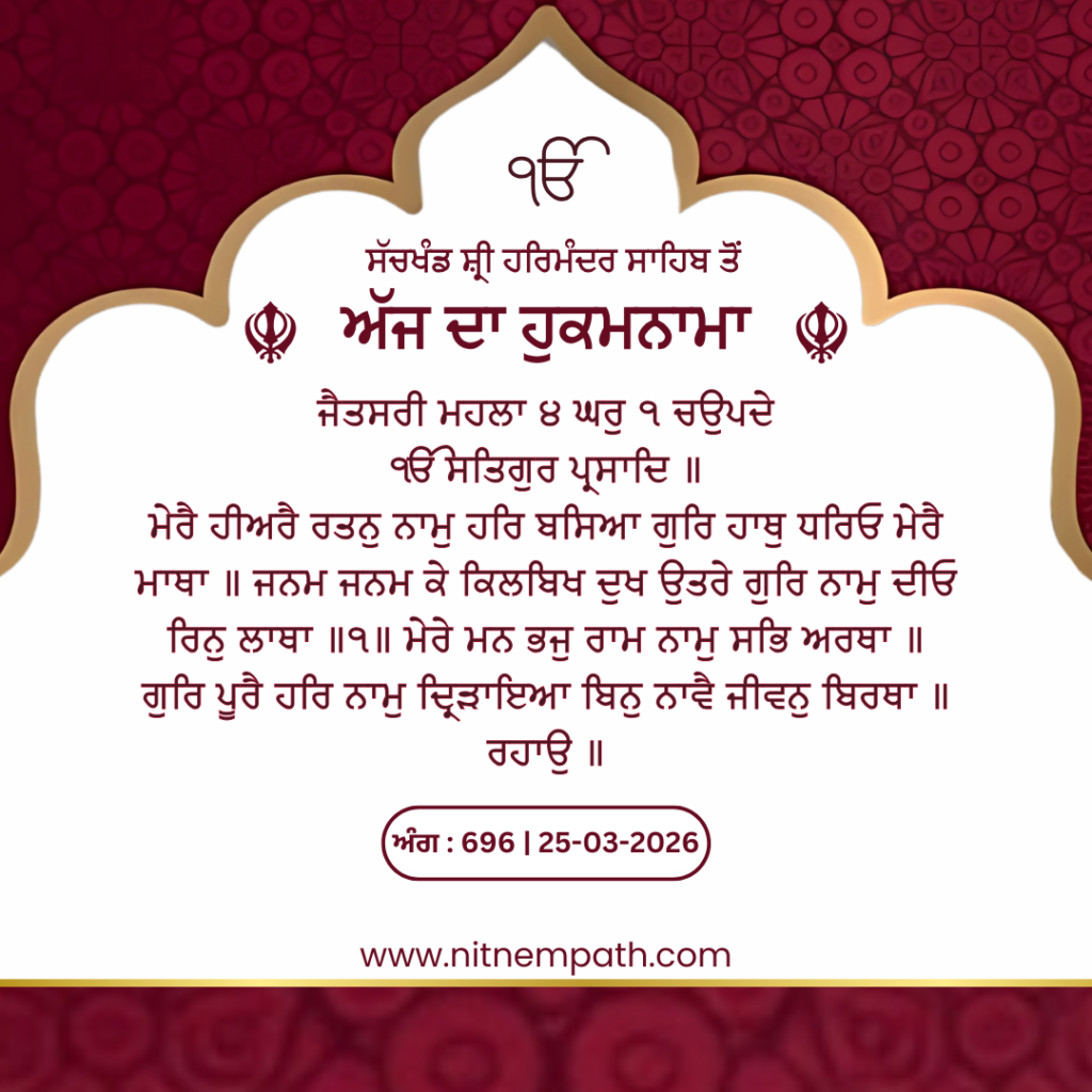 Hukamnama Sri Darbar Sahib, Amritsar, Date 25-03-2026 Ang 696