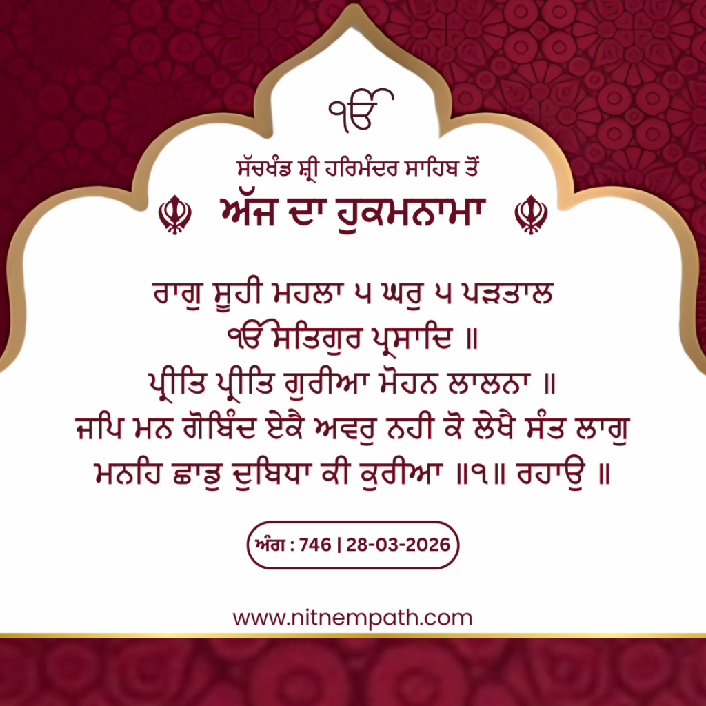 Hukamnama Sri Darbar Sahib, Amritsar, Date 28-03-2026 Ang 746
