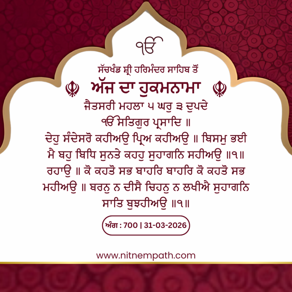 ਜੈਤਸਰੀ ਮਹਲਾ ੫ ਘਰੁ ੩ ਦੁਪਦੇ ੴ ਸਤਿਗੁਰ ਪ੍ਰਸਾਦਿ ॥ ਦੇਹੁ ਸੰਦੇਸਰੋ ਕਹੀਅਉ ਪ੍ਰਿਅ ਕਹੀਅਉ ॥ ਬਿਸਮੁ ਭਈ ਮੈ ਬਹੁ ਬਿਧਿ ਸੁਨਤੇ ਕਹਹੁ ਸੁਹਾਗਨਿ ਸਹੀਅਉ ॥੧॥ ਰਹਾਉ ॥
