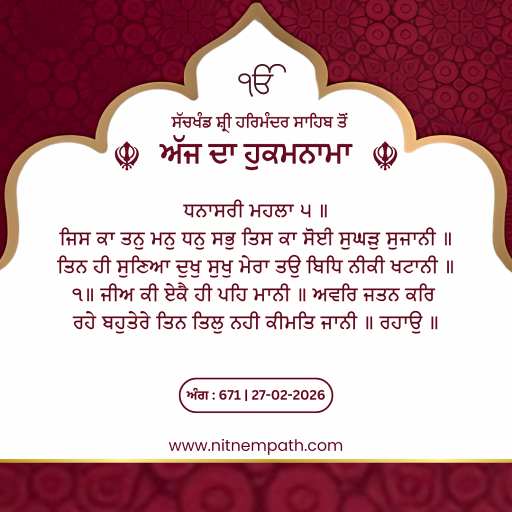 Hukamnama Sri Darbar Sahib, Amritsar, Date 27-02-2026 Ang 671